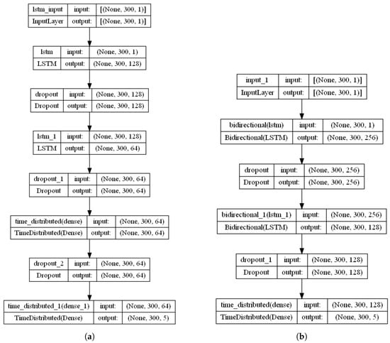 The employed deep learning network architectures: (a) LSTM Model Architecture. (b) BiLSTM Model Architecture.
