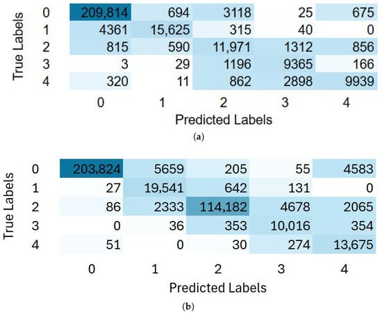 Figure 9 illustrates the confusion matrix analysis obtained from Dataset 1 using both LSTM and BiLSTM models. As shown in Figure 9a, the LSTM model shows strong classification performance, correctly identifying most samples across all classes. The majority of true labels, particularly the class 0 (209,814 instances) and class 1 (15,625 instances), were accurately predicted, reflecting high precision and recall for these classes. Misclassifications were relatively low and mainly occurred between classes with similar characteristics, such as class 3 and class 4. This pattern aligns well with the high overall accuracy (95.22%) and weighted F1-score (0.9518) reported in Table 4, confirming that the LSTM effectively learned the temporal dependencies within the dataset.