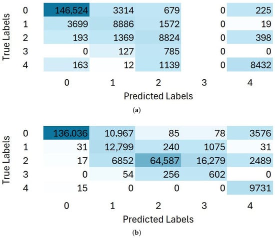 In contrast, Figure 10b shows that the BiLSTM model also achieved good overall performance but exhibited more misclassifications compared to the LSTM. The BiLSTM model correctly classified the majority of samples, for example, 136,036 instances for Class 0 and 64,587 for Class 2, but it displayed higher off-diagonal values, particularly confusion between Classes 2 and 3 (16,279 instances). This suggests that while the bidirectional architecture improved context awareness, it may have introduced redundancy in sequence learning, slightly reducing precision for certain classes. Despite its strong recall (macro-average shown in Table 4), these misclassifications contributed to a marginally lower overall accuracy and F1-score compared to the LSTM.
