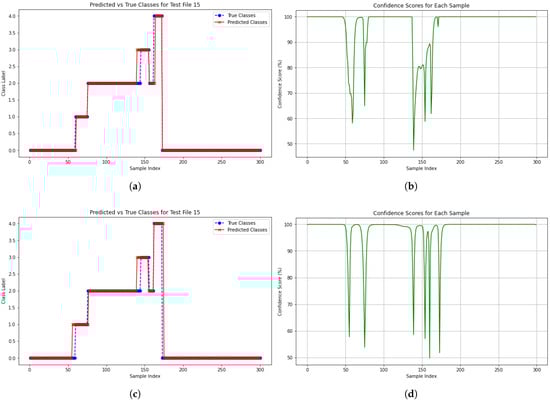 Figure 11a,c compare the true and predicted class labels across 300 samples, where blue markers indicate ground-truth labels (true class) and red markers represent model predictions (predicted class). Overall, both models exhibit strong agreement between true and predicted classes, with most points overlapping. However, noticeable deviations occur around sample indices 130–160, corresponding to dips in the confidence score plots shown in Figure 11b,d.