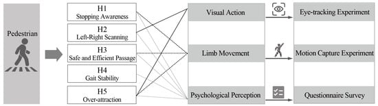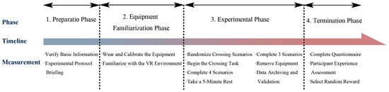 Based on the Unity 2019.4.26f1c1 engine and VR plug-ins, we developed a virtual reality platform that reproduces typical urban street-crossing scenarios with a baseline zebra crossing and multiple visual guidance elements [41,42]. Participants completed a series of street-crossing tasks from a first-person perspective, and the overall experimental framework is shown in Figure 3. By combining different visual elements, we defined multiple experimental conditions and adopted a three-modality data-collection protocol (Figure 4): questionnaire surveys captured subjective perception and safety cognition, eye tracking recorded visual attention characteristics, and motion capture measured locomotor parameters, enabling full-process monitoring from cognition to behavioral response.