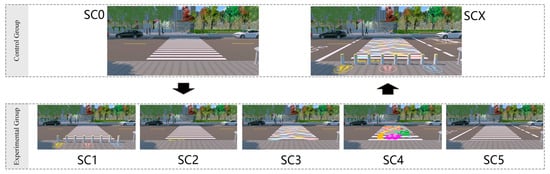 To isolate the net effect of ground-level visual guidance and to meet ethical and safety requirements, the VR environment did not include dynamic traffic flow, driver–pedestrian interactions, or other pedestrian interference. The traffic context was composed solely of static signs and pavement markings, and the soundscape was maintained as constant background noise.