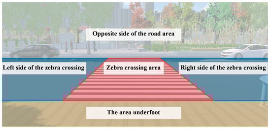 This study focused on the effects of economically feasible, easy-to-implement “soft measures” on street-crossing behavior. Using the Unity3D engine, we constructed seven VR street-crossing scenarios that simulated a typical urban road environment with a zebra crossing, traffic signs, and pavement markings. These scenarios preserved ecological validity while enhancing experimental control and reproducibility. In each scenario, different visual elements were superimposed on the same baseline zebra crossing (Figure 5 and Table 2), and key regions were segmented into multiple Areas of Interest (AOI) to precisely record participants’ fixations on critical locations (Figure 6).