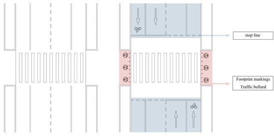 However, related studies indicate that the design of many existing visual elements is largely informed by an “adult perspective” and is not fully aligned with children’s visual cognition and behavioral development. Colored visual elements can exert bidirectional effects on traffic behavior: guidance facilities such as Footprint (stop) markings can enhance children’s Stopping–Scanning Awareness, yet overly complex patterns may fixate their attention on the pavement and weaken monitoring of the surrounding dynamic traffic environment [34]. Research on Tactile Paving Patterns zebra crossings likewise suggests that, although these designs can strengthen drivers’ yielding behavior, their specific effects on child pedestrians remain unclear [24,39,40].