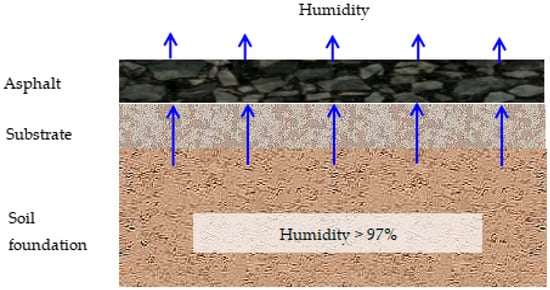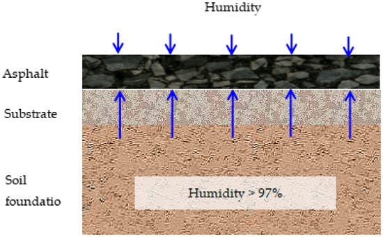 (2) Permeation-type water vapor transport (PT-WVT): With prolonged service, asphalt mixtures gradually absorb and retain moisture due to their porous and semi-permeable nature. Once moisture reaches dynamic equilibrium, PT-WVT becomes the dominant mode; the subgrade (relative humidity > 97%) serves as a continuous moisture source, and water vapor migrates upward through capillary action and interconnected pores between the subgrade and the asphalt layer, as shown in Figure 2. PT-WVT is typically evaluated using the ASTM E96/E96M standard [26], which simulates steady-state moisture permeation.