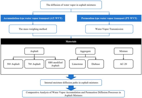 AT-WVT and PT-WVT in asphalt, aggregates, and voids are first quantified through a combination of laboratory tests and theoretical calculations. Subsequently, the internal diffusion paths of these two water vapor transport modes within asphalt mixtures are analyzed with a focus on how microstructural features regulate path tortuosity and migration resistance. Finally, the intrinsic relationship between AT-WVT and PT-WVT is explored, including their dynamic transition across the pavement lifecycle and the influence of AT-WVT-induced capillary channels on PT-WVT efficiency. The paper’s technical roadmap is depicted in Figure 3.