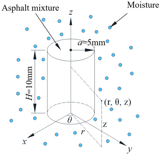where and represent the asphalt film’s thickness, mm; is the aggregate’s thickness, mm; , , , and represent the moisture concentration, g/mm3; is the permeation moisture diffusion coefficient of asphalt, mm2/h; and is the accumulation moisture diffusion coefficient of asphalt, mm2/h.