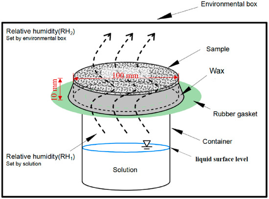 The relative humidity outside of the container (RH2 = 60%) was regulated by an environmental chamber, which ensured constant temperature and humidity. The RH1 inside of the container and the RH2 outside produced the relative humidity gradient required. Driven by this humidity gradient, water vapor accumulated above the liquid surface inside of the container, penetrated the specimen, and gradually diffused into the environmental chamber.