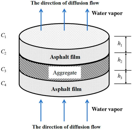 Aggregate particles coated with asphalt membrane can be conceptually divided into a three-layer material combination. As shown in Figure 7, the middle aggregate particles are completely enveloped by the upper and lower asphalt films. Water vapor can permeate from both the top and bottom sides of this composite structure. The concentration gradients C1, C2, C3, and C4 at different positions drive water vapor diffusion through the asphalt films and the aggregate. The thicknesses h1, h2, and h3 of each layer (asphalt film–aggregate–asphalt film) also impact the rate and path of water vapor diffusion, which is of great significance when studying the moisture damage mechanism of asphalt mixture.