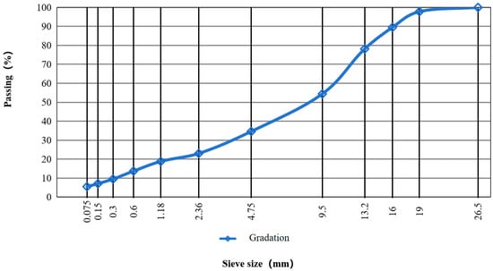 All asphalt mixtures were made of the SBS-modified asphalt binder and limestone aggregates, which were identical to those used in the water vapor diffusion tests. The asphalt–aggregate mass ratios of the five mixtures were 3.5%, 4.0%, 4.3%, 4.5%, and 5.0% by aggregate weight, respectively. Notably, the optimal asphalt–aggregate mass ratio is 4.3%. The aggregate gradation of all mixture types was identical, as shown in Figure 8. The volume index test results of asphalt mixture specimens are shown in Table 3.