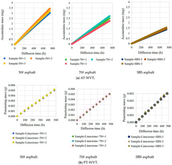 As the diffusion time increases, the cumulative mass (Figure 9a, AT-WVT condition) and the permeating mass (Figure 9b, PT-WVT condition) of all samples exhibit a consistent upward trend. For the same samples, the data from three replicate tests show high consistency, which confirms the repeatability and stability of the experiment. Notably, discrepancies exist in the growth rates across samples.