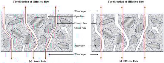 Accordingly, the water vapor diffusion coefficient measured in accordance with the ASTM e96/e96 m-16 Standard [26] Test method is not the real diffusion coefficient but an “effective diffusion coefficient.” In this method, the thickness of the asphalt mixtures is taken as the length of the diffusion path (as shown in Figure 10b), and the entire cross-sectional area is assumed to be the diffusion area (as shown in Figure 11b). Therefore, the effective diffusion coefficient is calculated according to the thickness and the entire cross-sectional area of the asphalt mixtures, as shown in Equation (17):