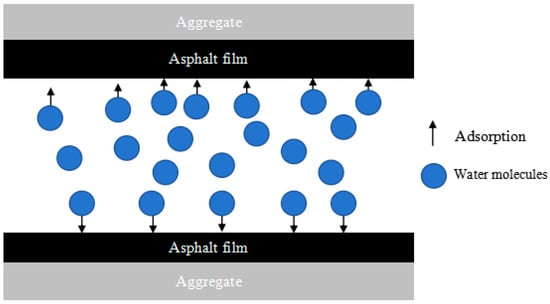 When the moisture molecules inside of the asphalt mixture are saturated, they penetrate the asphalt’s film and continue to diffuse towards the interface between asphalt and the aggregate, resulting in the peeling off of asphalt from the aggregate surface. At the same time, the water vapor molecules adsorbed on the surface of the asphalt membrane form capillary tubes, and the water supply gas passes quickly, as shown in Figure 13.