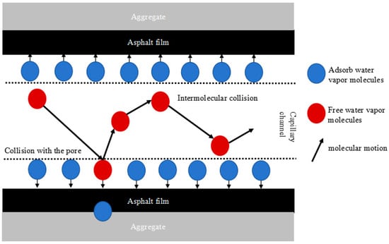 After the capillary tubes are formed, free water and gas molecules in the pore channels continue to diffuse under the effects of the relative humidity difference, molecular collisions, and collisions between molecules and pore walls. Finally, they penetrate the asphalt mixture and diffuse into the air. At this time, PT-WVT is the main form of water vapor diffusion.