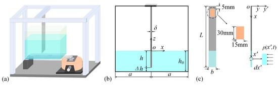 The key dimensions and relative positions of the container and PEH are shown in Figure 1b,c. In the reference model, the container has a width of and a thickness of . The distance between the free end of the beam and the container bottom is , and the immersion depth of the beam is . The PEH consists of a cantilever beam and a piezoelectric ceramic (PZT-5H), where the piezoelectric ceramic has dimensions of . The cantilever beam has a length , width , and thickness . The cantilever beam is made of aluminium, with a density of , and an elastic modulus of . The container is filled with water, which has a density of . The ambient temperature is set to 30 °C based on the average room temperature during the experiment, with the dynamic viscosity of water corresponding to .