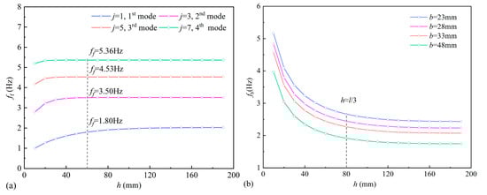 Based on the parameters given in the reference model, the sloshing frequencies of the first four antisymmetric modes of the liquid with varying liquid depth are shown in Figure 2a. When the liquid depth in the container is relatively shallow, the liquid natural sloshing frequency increases gradually as the liquid depth increases, and the higher-order sloshing frequencies change faster. When the immersion depth exceeds 40 mm, the natural sloshing frequencies of liquid above the third order remain relatively stable, and when , the first-order liquid natural sloshing frequency also remains relatively constant.
