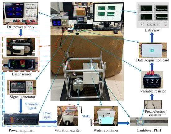In the experiment, the signal generator produces a sinusoidal signal, which is converted into a driving signal by the power amplifier. The driving signal is then transmitted to the vibration exciter, driving it to oscillate at the desired frequency and amplitude. The displacement of the vibration exciter is captured by the laser displacement sensor (red-arrow marked in the figure) and transmitted to the computer to ensure the accuracy of the excitation frequency and amplitude. An acrylic (PMMA) tank is adopted as the liquid-filled container, as its transparency enables visual observation of liquid sloshing. Uniform stiffness satisfies the “rigid body” assumption in the theoretical model, and its low damping characteristic aligns with practical on-vehicle plastic reservoirs, ensuring engineering relevance. The container is filled with a specified depth of water. One end of the container moves up and down, driven by the vibration exciter, which causes the water to slosh, and the resulting fluid load excites the cantilever beam to vibrate. Due to the direct piezoelectric effect inherent in piezoelectric materials, a piezoelectric ceramic (PZT-5H) is bonded with epoxy resin to the fixed end of the cantilever beam—where strain is maximal—to form the PEH. The variable resistor is connected to the piezoelectric element, and the electrical output is measured by the data acquisition card. The collected data is then transmitted to the computer and recorded using LabVIEW.