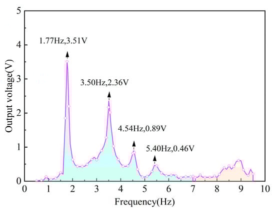 A frequency sweep test is performed to study the output characteristics of the PEH. The maximum effective stroke range of the vibration exciter used in the experiment is ± 10 mm. In the test, the vibration exciter performs sinusoidal motion at a given frequency with an amplitude of 10 mm. This ensures the test accuracy of the PEH’s response characteristics operating within the frequency range of 0.5–9 Hz. The root mean square (RMS) open-circuit voltage varying with the excitation frequency is shown in Figure 4. It clearly shows that when the excitation frequency is relatively low, the PEH produces virtually no voltage or energy output. However, as the excitation frequency increases, the PEH maintains a continuous voltage output. Within the frequency range of 1–7 Hz, there are four resonance peaks, and the RMS open-circuit voltages are 3.51 V, 2.36 V, 0.89 V and 0.46 V, respectively. Beyond 7 Hz, the PEH exhibits irregular voltage output, as illustrated in Figure 4.