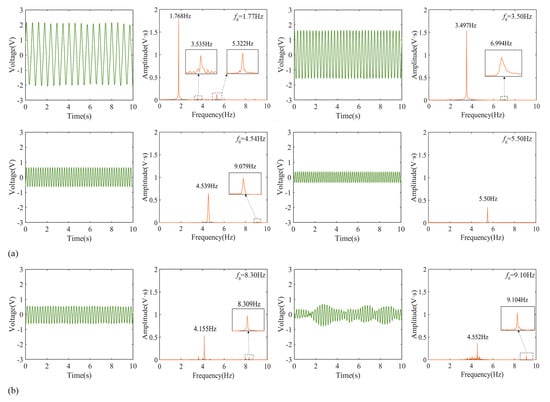 The voltage output of the PEH in both the time and frequency domains: (a) resonance frequencies; (b) three-dimensional sloshing mode.