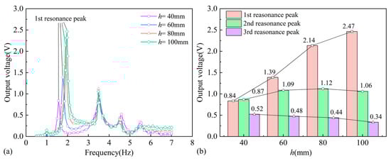 The variation in the immersion depth affects the liquid sloshing and the added mass of the beam, thereby altering the output of the PEH. The voltage output of the PEH with different immersion depths is shown in Figure 6a. When h = 40 mm, there are five obvious resonance peaks within the test frequency range, while when the immersion depth exceeds 80 mm, only three distinct peaks can be identified. Additionally, the magnitude of each resonance peak decreases gradually, and this attenuation becomes more pronounced as the immersion depth increases.
