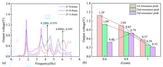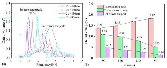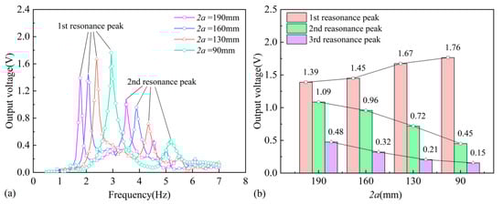 Effects of the liquid width with foam at the excitation side: (a) the voltage output; (b) the resonance peak values.