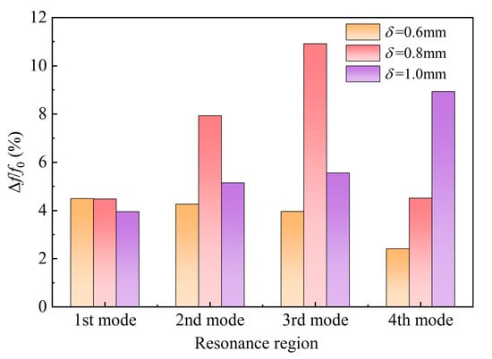 As shown in Figure 10, when the first-order immersed natural frequency of the 0.8 mm thick beam is close to the third-order antisymmetric natural sloshing frequency, its bandwidth coefficient is nearly twice that of other resonance peaks, reaching a maximum of approximately 11%. When the first-order immersion natural frequency of the beam with a thickness of 1 mm is close to the fourth-order antisymmetric natural sloshing frequency, its bandwidth coefficient is more than three times higher than that at its first-order resonance peak, reaching 8.93%.
