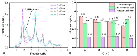 The voltage output variation and the resonance peak voltages of the PEH with different beam widths are shown in Figure 11. As shown in Figure 11a, when the width of the beam varies, the voltage outputs of the PEH show the same variation trend with the excitation frequency, with no change in the resonance frequencies. The voltage output of the first resonance peak decreases as the beam becomes wider, while the second resonance peak voltage increases gradually. As the beam becomes wider, the added mass produced by the liquid increases, causing the first-order immersed natural frequency of the beam to decrease. Consequently, the small peak between the first and second resonance frequencies shifts forward, and its voltage output also increases gradually.