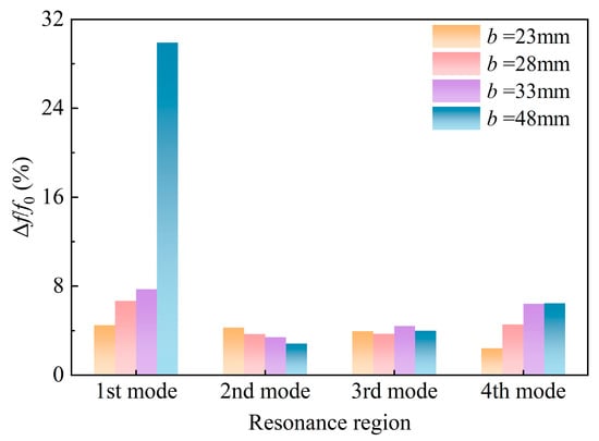 To further clarify the phenomenon that “the bandwidth increases significantly when the natural frequency of the partially immersed beam is close to the liquid natural sloshing frequency”, Figure 10 quantifies this effect using the bandwidth coefficient (i.e., Δf/f0) across different resonance regions. The bandwidth coefficient is defined as the ratio of the effective bandwidth Δf to the central frequency f0, where the central frequency f0 is the peak excitation frequency, corresponding to the maximum voltage output amplitude Vmax; the effective bandwidth Δf is determined using the half-power bandwidth method. Specifically, two characteristic frequency points on both sides of the central frequency f0 are identified at which the voltage amplitude decays to Vmax/(≈0.707Vₘₐₓ), and the interval between these two frequency points is defined as the effective bandwidth Δf.