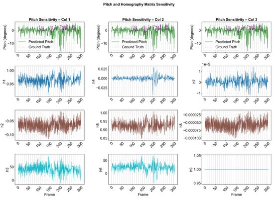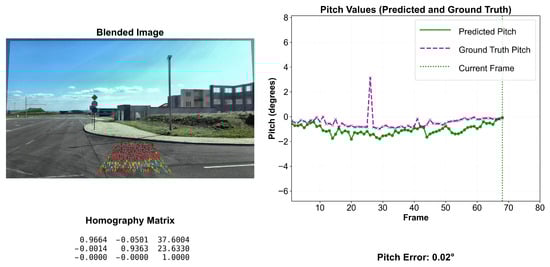 In this analysis, several parameters of the homography matrix, such as and , exhibited correlations of approximately 0.3 with the pitch plots and, consequently, with the curb jumps. While these initial findings do not yet establish a definitive link, they highlight promising directions that merit deeper investigation, and we intend to explore these relationships more thoroughly in future work (Figure 6).