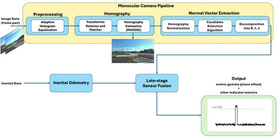 On the image-based side of the architecture, the core operation is the calculation of the inter-frame homography, from which our key indicator metrics are derived detailed in Section 3.1. The algorithm processes consecutive image frames from the camera data stream, each of which is first passed through a pre-processing module designed to rectify the images and enhance local contrast, for example, using Adaptive Histogram Equalization [27] to facilitate more reliable matching. Feature correspondences are then established using a recently published transformer-based matcher called EfficientLoFTR [28], which is particularly effective at handling weak matches. In all experiments, the publicly released pretrained model provided by the authors is employed. A comprehensive description of the network architecture, training procedure, and implementation details is presented in the original publication. This capability is essential for road environments that lack strong, easily detectable features such as lane markings. The resulting matches, filtered by a predefined region of interest, are subsequently used by a MAGSAC-based [29] plane-estimation module to compute the homography between the two frames. MAGSAC replaces the fixed inlier-threshold of RANSAC with a noise-marginalized scoring scheme, yielding more reliable model estimates in low-texture regions and reducing the sensitivity to threshold tuning. The estimated homography is then normalized to remove the influence of the camera intrinsic matrix and to prepare it for our custom candidate selection algorithm. Candidate selection is a necessary step because a homography does not correspond to a unique rigid motion. Ambiguities arise from sign indeterminacies and the quadratic nature of the decomposition equations. Since not all mathematical solutions are physically plausible, the algorithm constrains the possible solutions (typically four) and selects the valid one. The ambiguities introduced by the homography decomposition are resolved by enforcing a set of physically grounded constraints that eliminate solutions incompatible with plausible road geometry. Candidate solutions whose forward translation is non-positive are discarded, since they imply motion behind the camera. The surface normal is then constrained component-wise: lateral deviations are limited by requiring ( < 0.1), vertical deviations must satisfy ( < −0.9), and the normal’s depth component is restricted to the interval (−0.3 0.3), which excludes vectors that become nearly parallel to the road surface or flip direction under steep inclination or declination. After these geometric filters, the remaining normals are compared against a reference deviation vector using an angular threshold of (). Candidates exceeding this deviation are rejected. This procedure ensures that only physically meaningful, orientation-consistent normals are retained. All constraints and outputs follow standard computer-vision conventions, with a right-handed coordinate system in which the Z-axis points forward along the optical axis, the X-axis to the right, and the Y-axis downward. After this step, the homography is decomposed, and the road surface normal vector is extracted, implicitly defining the best-fitting local plane for the current road region.