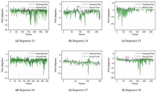 Pitch results for the six test sequences (13–18). The pitch values are derived from the estimated road surface normal obtained through homography computation. For curb-detection purposes, the filtering normally applied in the pitch-estimation pipeline was disabled, which improves sensitivity to curb geometry but reduces the accuracy of the pitch itself. This adjustment rendered the ground-truth pitch unsuitable for direct comparison in this context, but the unfiltered pitch estimates remain effective for detecting curb geometry.