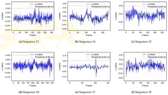 As previously mentioned, we collected our own dataset and recorded six distinct sequences to evaluate the performance of the proposed algorithm. In the following section, each sequence is examined individually in order to provide a detailed account of the results and highlight the differences between specific cases. Figure 4 presents the gamma metric for all sequences, which serves as one of the primary indicators of sudden changes in the road surface. Complementing this, Figure 3 shows the pitch plots derived from the homography-based road surface normal, providing additional insight into the geometric characteristics of the encountered curb jumps and gradient changes. Taken together, these figures provide the general context for interpreting the signals, while the following subsections examine each of the six recorded sequences in detail, discussing how the proposed metrics behave in practice and how they support or challenge our hypothesis.