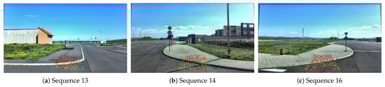 The results collectively indicate that image-based curb detection is feasible even when the geometric discontinuity is small. Across Sequences 13–15, the -metric crosses the predefined 0.05 m threshold at the first significant spike, and the pitch plots exhibit coincident excursions, while the mean reprojection error remains low throughout. Together, these observations support the claim that a stable homography estimated from robust geometric correspondences carries predictive signal for sudden road surface gradient changes such as curbs and road edges, and that the recovered transformation is geometrically faithful enough to be actionable.