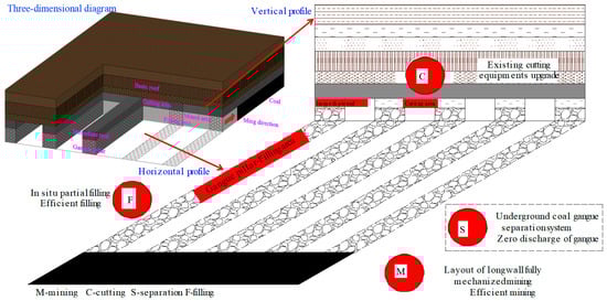 As shown in Figure 1, the cut-and-fill mining process includes the coal mining process, roof cutting process, and filling process, forming the process flow of mining, cutting, and filling. If considering underground coal gangue separation, filling can form another mode of the coal mining–cutting–separation–filling process. Cut-and-fill mining can integrate the high efficiency characteristic of long-wall caving mining with the operational simplicity of partial filling methods.
