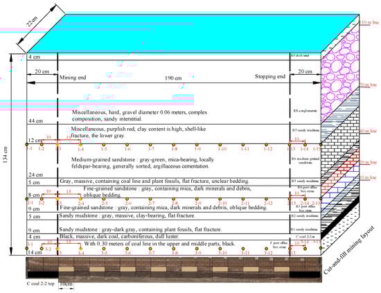 As shown in Figure 3, to facilitate the cutting of the roof, a cutting-top board was embedded at the bottom of the R1 sandy mudstone as the cutting-top layer. The dimensions of the cutting-top board were 22 cm × 10 cm × 4 cm, with a cutting-top width of 10 cm and a cutting-top thickness of 4 cm. The experimental plan designed a mining range of 150 cm, with eight pre-embedded wooden boards, which means eight cutting areas which were 80 cm, and seven filling areas which were 70 cm.