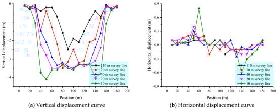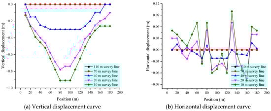 As shown in Figure 5, after caving mining, the subsidence values of each measurement point on the 10 m and 20 m survey lines closer to the coal seam are relatively large. The maximum vertical displacement near the surface on the survey line is 2.51 m. Due to the transitional and random nature of the collapse, there are many singular points of horizontal deformation, with the maximum horizontal displacement at the surface being approximately 0.19 m. The origin of the coordinates is on the left side of the model, and the displacement data is obtained from model monitoring data after conversion using a size similarity ratio. Since the size similarity ratio is 1:100, when the unit is m, it represents the actual dimension, and when the unit is cm, it represents the model dimension.