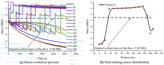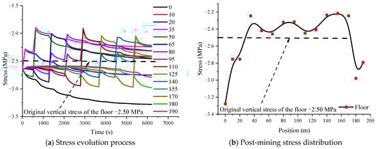 Figure 7a is the stress evolution process of measuring points at different positions of the floor during the mining process of the caving method, and the original vertical stress of the floor is 2.50 MPa. During the mining process, the stress of the measuring point in the goaf experienced a process of increasing–decreasing–stabilizing, and the stress of the measuring point in the coal pillar was in a monotonically increasing process.