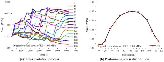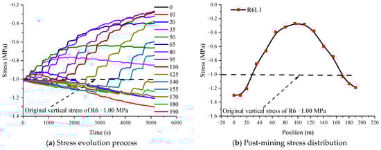 It can be seen in Figure 8 that the original vertical stress of the R6 rock stratum is 1.00 MPa, and the stress evolution process of the R6 rock stratum is similar to that of post-mining stress distribution, which is not repeated here. The negative value of stress monitoring data is expressed as compressive stress, which is converted by a strength similarity ratio.