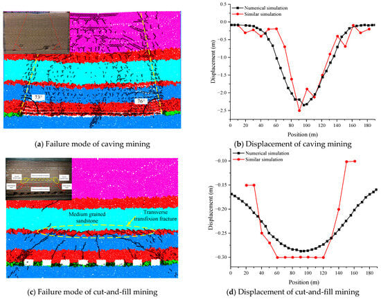 The stope model was established by using the calibrated rock parameters to carry out the mining of caving method and cut-and-fill mining method, respectively. Following the coal seam caving mining process, numerical simulation generated the fracture morphology of the rock layer as depicted in Figure 11a, accompanied by the subsidence curve illustrated in Figure 11b. Subsequently, the fracture morphology of the bedrock resulting from numerical simulation after cut-and-fill mining is presented in Figure 11c, and the corresponding bedrock subsidence curve is depicted in Figure 11d. Notably, the fracture morphology of the rock strata in both the numerical simulation and the analogous simulation test exhibited a high degree of congruence, with the displacement error along the same monitoring line falling within an acceptable range. This consistency suggests that the modeling method and parameter selection for the numerical model are reasonable and can be reliably employed for subsequent analyses.