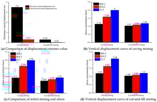 - Through a similar simulation, the maximum surface vertical and horizontal displacement reached 2.51 m and 0.19 m of caving mining, resulting in a stepped subsidence pattern. The maximum vertical and horizontal displacement along the 40 m survey line was 0.29 m and 0.02 m of cut-and-fill mining, offering a more uniform and controlled deformation pattern. The stress concentration coefficient of the floor in cut-and-fill mining was 56.00% of that in caving mining.