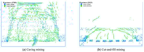 Statistics of fracture types and quantities for caving and cut-and-fill mining are shown in Figure 13 and Table 1. In the case of caving mining, a total of 3789 fractures were generated, with shear fractures comprising 34.9% (1325 fractures) of the total, predominantly localized on both sides of the fracture angles. Tension fractures, numbering 2464, accounted for 65.1% of the total fractures and were primarily situated in the adjacent rock layers above the goaf and on both sides of the fracture angles. This indicates a prevalence of tensile failure in the adjacent rock layers above the goaf, with both shear and tensile failures occurring on both sides of the fracture angles.