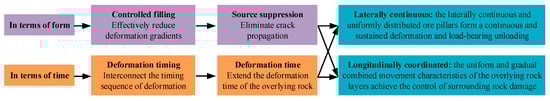 In terms of the temporal aspect of mining-induced damage, based on the granular mechanics characteristics of the gangue column, the overlying strata disturbed by the cooperative mining process of the gangue column undergo a continuous and stable unloading process for the entire mining area. Compared to caving mining, under the joint action of controlled density and continuous distribution of the gangue columns, the deformation of the overlying strata in the mining area is linked together, and the overall deformation time is extended.