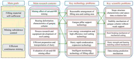 As shown in Figure 15, the main goal of cut-and-fill mining is to achieve self-sufficiency and in situ filling of filling materials, thereby significantly reducing material costs, improving filling efficiency, and increasing environmental benefits. However, the effectiveness and applicability of cut-and-fill mining require comprehensive and systematic examination through various means. The design of the cut-and-fill mining process system, as well as the development of essential equipment, forms the foundation for implementing this mining method. The establishment of a stable gangue column bearing structure after cut-and-fill mining is pivotal to the success of the entire process. Additionally, the development of new grouting materials is essential to enhance the stability of the cut-and-fill mining stope. The monitoring and control of the whole process of cut-and-fill mining is also a necessary research focus to evaluate the roof cutting and filling mining.