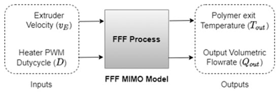 The dynamics of the FFF process can be viewed as a two-input, two-output system, as shown in Figure 1. The inputs to the system are the duty cycle () of the pulse width modulated (PWM) signal that controls the heater in the liquefier block and the linear input velocity of the filament into the liquefier (), while the outputs from the system are the melt temperature of the polymer exiting the nozzle () and the output polymer flow rate (). The goal of this work is to model the dynamics of the FFF process to develop analytical and data-driven process models that are appropriate for real-time process control.