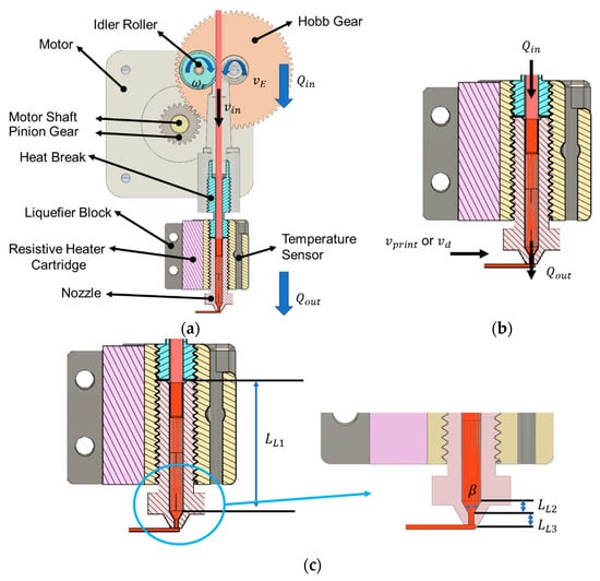Figure 2 shows the construction of a direct-drive extrusion system used in the FFF process. In the FFF process, the input polymer flow rate () to the liquefier is controlled to produce an output flow rate () from the liquefier that is proportional to the deposition velocity (), resulting in a road of uniform cross-sectional area, as defined by the slicer during toolpath generation. The cross-sectional area of the deposited road () is defined by the extrusion width () and layer height () parameters and can be computed according to Equation (1).