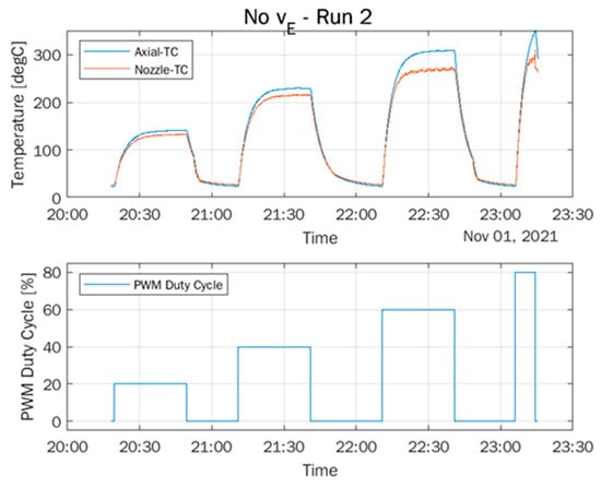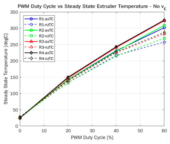 The temperature distribution inside the liquefier and the output temperature of the polymer melt exiting the nozzle is a complex function of many factors, including material properties, liquefier geometry, residence time, shear, frictional forces, and the input volumetric flow rate of the filament into the liquefier. Because of the dynamic complexity of the system, it is not feasible to derive a model from the fundamental principles. Therefore, experimental temperature data are taken to develop an empirical model. Based on prior knowledge of the process, the input filament feed rate () directly impacts since the temperature distribution inside the nozzle becomes less homogeneous at higher , leading to a lower . Thus, will be used as an input in addition to the heater PWM duty cycle () to develop an empirical model for temperature dynamics. To test for the linearity of the temperature dynamics, open loop step tests were performed, wherein the was increased from 0 to 60% in 20% increments and the resulting steady-state liquefier temperatures were recorded. Figure 3 shows the results of open loop step tests, and within the FFF operating temperature range (180 °C to 300 °C), the temperature dynamics are found to be linear.
