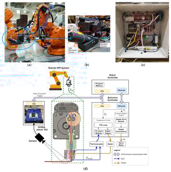 (a) Robotic FFF testbed; (b) close-up view of vision-based measurement system; (c) control system for extrusion control and synchronization with robot motion; (d) overview of architecture and signal flow for the robotic FFF testbed.