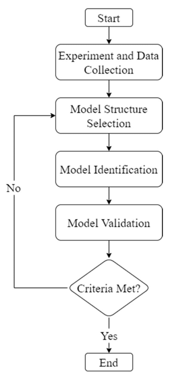 System identification is a methodology for building mathematical models of dynamic systems using measurements of the input and output signals of the system. The general workflow of a system identification process is shown in Figure 6. The process of system identification involves the following steps: (1) designing appropriate excitation experiments; (2) collecting high-quality synchronized input–output data; (3) applying estimation methods to derive models in the chosen structure (e.g., transfer functions or state space representations); (4) validating the models against separate datasets to determine whether the model is adequate for the application requirements. To obtain a reliable model of the FFF process, the measured data must adequately reflect the system’s dynamic behavior. The accuracy of the identified model therefore depends directly on the quality of the acquired data, which in turn is dictated by the experimental design. Model selection in the identification workflow was based on three criteria: the suitability of the model structure for control implementation, the physical interpretability of the process–model parameters, and the model accuracy, as quantified using the NMRSE metric. An NMRSE fit of at least 85% was used as the acceptance threshold.