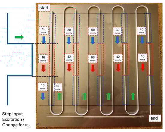 The test specimen consists of continuous paths with regions of varying deposition speeds to exercise the commonly used printing speeds of the FFF process. The printed test specimen and the locations of the step input excitations/changes in the deposition velocity () are shown in Figure 7. It is important to note that deposition velocity () and extruder velocity () are related through the road geometry model given by Equation (20); additionally, the commanded step changes in also result in step changes in , maintaining the requested road geometry.