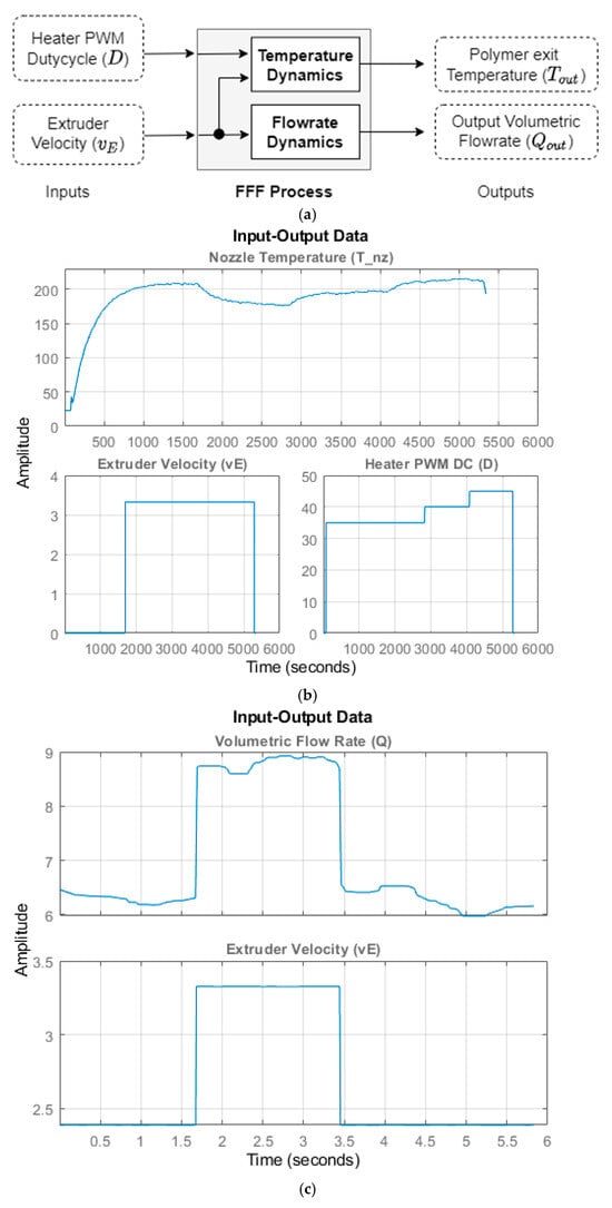 (a) FFF process model, represented as combination of MISO + SISO models for and ; (b) MISO data for output temperature (); (c) SISO data for flow rate ().